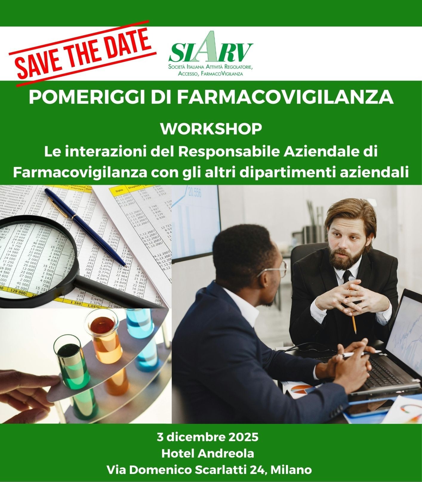 03/12/2025SIARV – POMERIGGI DI FARMACOVIGILANZA – WORKSHOP – LE INTERAZIONI DEL RESPONSABILE AZIENDALE DI FARMACOVIGILANZA CON GLI ALTRI DIPARTIMENTI AZIENDALI / Hotel Andreola, Via Domenico Scarlatti, 24, 20124 Milano MI - MM2 fermata Centrale/CaiazzoUn nuovo format interattivo per il classico appuntamento dedicato da SIARV alla Farmacovigilanza. Programma ed iscrizioni saranno presto disponibili! SEDE DEL SEMINARIO Hotel Andreola Via Domenico Scarlatti, 24, 20124 Milano MI MM2 fermata Centrale/Caiazzo Per ulteriori informazioni, contatta la Segreteria Organizzativa: New Aurameeting Srl Via Rocca d’Anfo, 7 – 20161 Milano Tel. 0039 02 6620 […] Scopri di più
