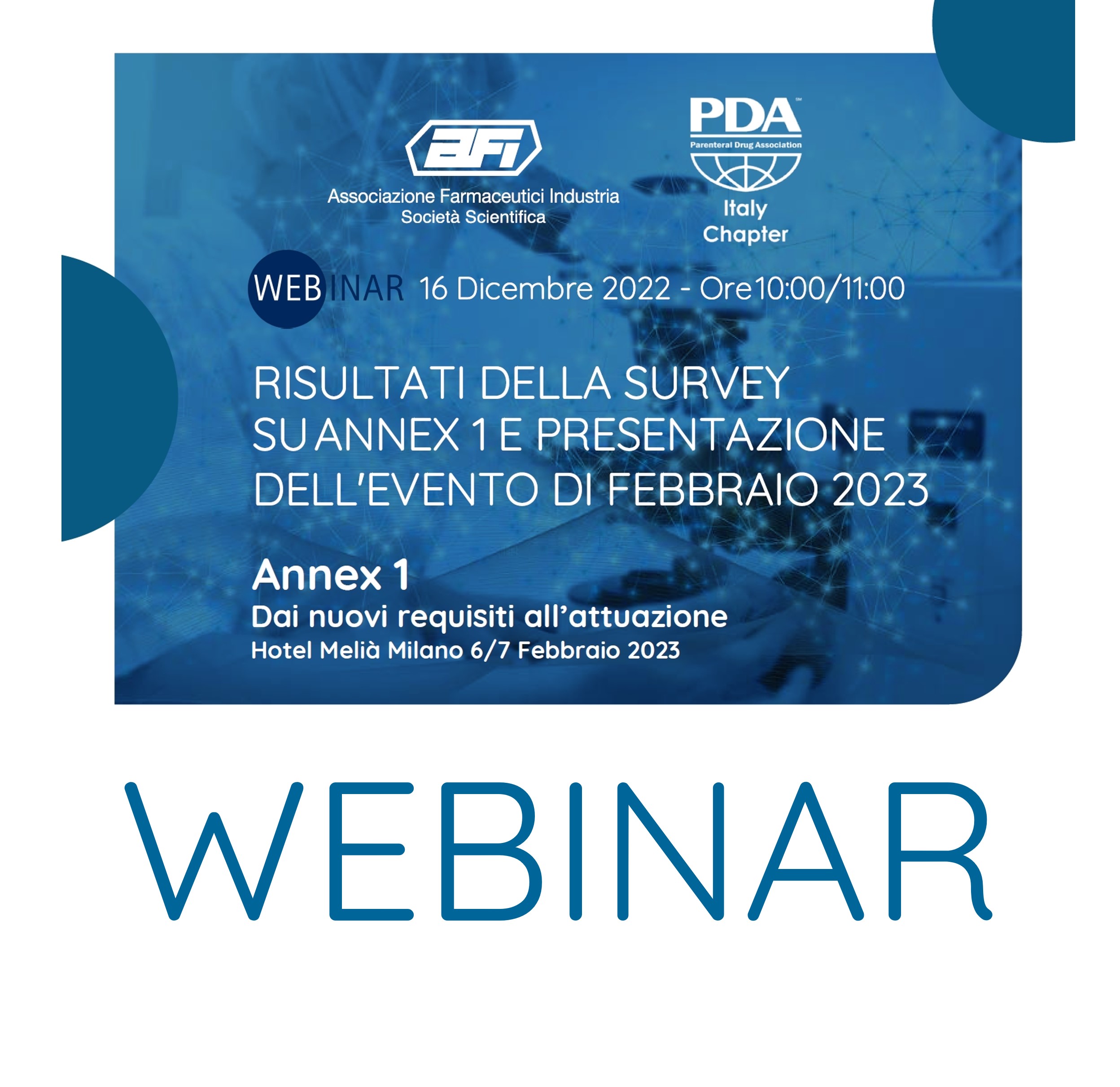 Venerdì 16 Dicembre 2022 si terrà un Webinar di presentazione dell’Evento, che condividerà i risultati della Survey su Annex 1 proposta da AFI e PDA ITaly Chapter ed introdurrà i contenuti e le modalità innovative di questo Evento.